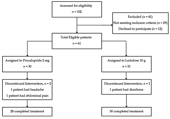 A total of 102 patients were approached to be recruited in this study (Figure 1). A total of 41 patients were not included in this study for several reasons. A total of 29 of them did not meet the inclusion criteria while 12 patients declined to participate in the study. Therefore, there were a total of 61 eligible patients who were recruited in this study. From the total of 61 patients who were recruited in this study, 30 were allocated to the Prucalopride 2 mg group and 31 were allocated to the Lactulose 10 g group.