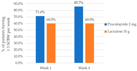 Overall, the proportion of patients with ≥3 spontaneous complete bowel movement (SCBM) over the 4 weeks treatment period was higher in the Prucalopride group (85.7%) than in the Lactulose group (60%), reaching significance at Week 4 (p = 0.029).