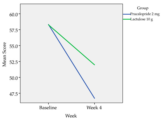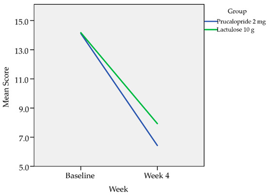 Repeated measure ANOVA with Huynh–Feldt correction determined that there is no statistically significant difference in the mean subscale 4 (treatment satisfaction subscale) at baseline and at four weeks between Prucalopride 2 mg and Lactulose 10 g with p-value of 0.356. However, the mean reduction was greater in patients treated with Prucalopride compared to Lactulose (Figure 4).