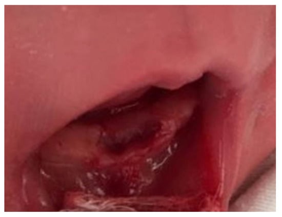 - Choi, S.C.; Park, J.H.; Choi, Y.C.; Kim, G.T. Sublingual Traumatic Ulceration (a Riga-Fede Disease): Report of Two Cases. Dent. Traumatol. 2009, 25, 48–50. [Google Scholar] [CrossRef]