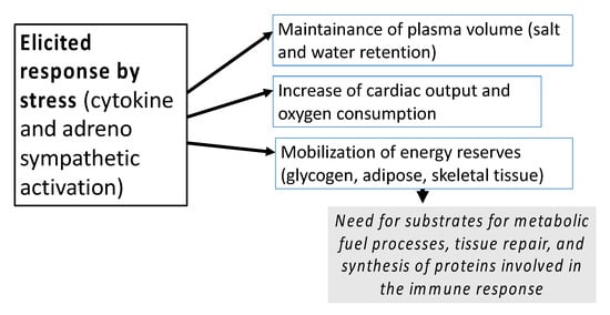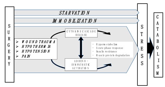 Surgical trauma induces hormonal, hematological, metabolic, and immunologic changes aimed to counteract the state of stress that challenges metabolic and physiologic equilibrium [,]. The stress response and tissue injury are strictly related; an enhanced stress reaction can lead to major adverse consequences including catabolism, hyperglycemia and immunosuppression (Figure 2).