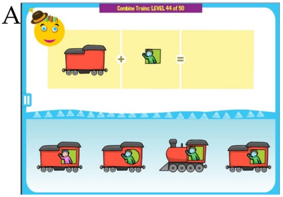 MITA nonverbal activities aim to provide the same PFS training visually through implicit instructions []. For example, a child can be presented with two separate images of a train and a window pattern, and a choice of complete trains. The task is to find the correct complete train. The child is encouraged to avoid trial-and-error and integrate separate train parts mentally, thus training PFS, Figure 2A. Different games use various tasks and visual patterns to keep the child engaged, Figure 2B. Most puzzles are assembled dynamically from multiple pieces in such a way that they never repeat themselves.