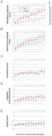 Longitudinal plots of subscale scores’ LS Means. Horizontal axis shows months from the 1st evaluation (0 to 36 months). Error bars show the 95% confidence interval. To facilitate comparison between subscales, all vertical axes ranges have been normalized to show 35% of their corresponding subscale’s maximum available score. A lower score indicates symptoms improvement. p-value is marked: *** < 0.0001; ** < 0.001; * < 0.05. (A) Receptive Language score. (B) Expressive Language score. (C) Sociability score. (D) Cognitive awareness score. (E) Health score.