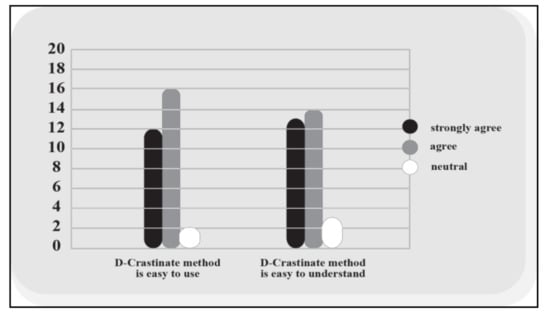 Concerning the extent to which the participants found the D-Crastinate method and its materials easy to understand, 27 (90%) of the participants either agreed or strongly agreed with the assumption that the D-Crastinate method was not difficult to understand (see Figure 1). However, three (10%) of the participants selected the neutral option. Some participants reported that some of the colours used in the booklet made the text a little hard to read and they suggested making the text background brighter. An example of these comments is, “Colours could be brighter, especially the purple one”. In general, the comments about the structure were positive and highlighted the benefit of using shapes and colours to match the content. The following are examples of comments about the structure and presentation of the D-Crastinate content: