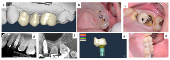 Single tooth restoration by screw-retained crown digitally planned by computer aided design (CAD) and CBCT (a); implant insertion was assisted by a surgical guide (b–e); fixture position was pre-operatively planned by simulation of crestal sinus membrane elevation (f,g).