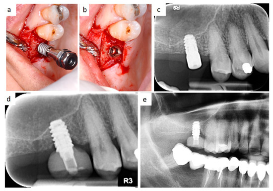 Intraoperative view of implant insertion by muco-periosteal flap elevation (a,b); the implant diameter is larger than implant site preparation, thus promoting bone dislocation in the apical direction by the self-tapping capability of the fixture and high primary stability. Radiological follow-up 3 months after insertion (c), 2 years after prosthetic rehabilitation (d), and after 10 years (e).