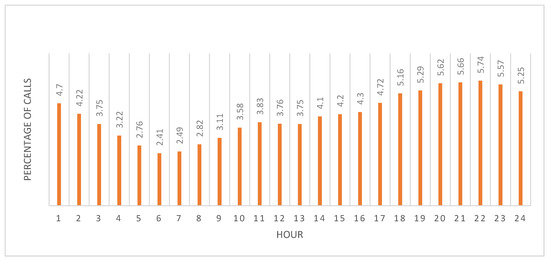 Most calls came by phone (96.91%) rather than by the mobile app. The highest percentage of calls was during April with 27.14% with May showing a similar high volume (24.17%); the lowest call volumes occurred before the pandemic in January and February (~15% each). Call volumes were lowest in the morning (06:00–07:00) and steadily increased until peaking at hour 20 (20:00) (Figure 2).