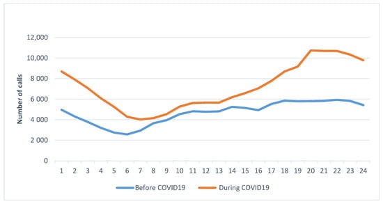 The percentage of calls was significantly higher for the nightshift with a change of 78.84% during COVID-19. The number of calls increased steeply starting at 14:00 and peaked from 20:00–22:00 before slowly returning to close to, but still above, the number of calls at 07:00 (Figure 3).