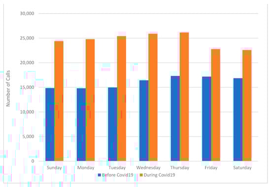 Thus, the nightshift experienced prolonged increased call volume throughout the entirety of the shift, not just for a few hours as observed before the pandemic. The pattern of calls over the days of the week was significantly different before and during COVID-19 (p < 0.05). Generally, during COVID-19 the peak of calls occurred on Tuesday through Thursday, compared with peaks on Thursday through Saturday (the weekend) before the pandemic (Figure 4), indicating that the pandemic altered weekly staffing patterns. Indeed, rather than having the lowest number of calls as was observed before the pandemic, calls changed by 67.5% on Mondays during the pandemic. Tuesdays had the greatest overall increase in calls with a 69.7% change.