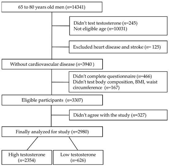Ko, D.H.; Kim, S.E.; Lee, J.Y. Prevalence of Low Testosterone According to Health Behavior in Older Adults Men. Healthcare 2021, 9, 15. https://doi.org/10.3390/healthcare9010015