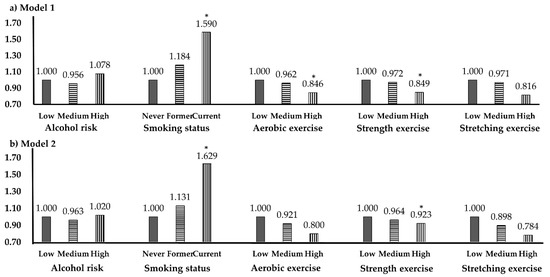 | Aerobic exercise | Low | 1160 (49.3%) | 336 (53.7%) | 0.036 * |