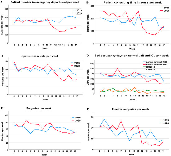 Time course of patient presentations, surgeries, and inpatient case numbers. The data of the 2nd to 17th weeks in 2019 (blue) and in 2020 (red) were compared. From the 11th week onwards, a decrease in case numbers could be detected, which could be attributed to the COVID-19 pandemic. (A) Patient numbers in the emergency department per week; (B) Patients consulting hours per week; (C) Stationary case rates per week; (D) Bed occupancy days on the normal and intensive care units per week; (E) Number of surgeries per week; (F) Number of elective surgeries per week.