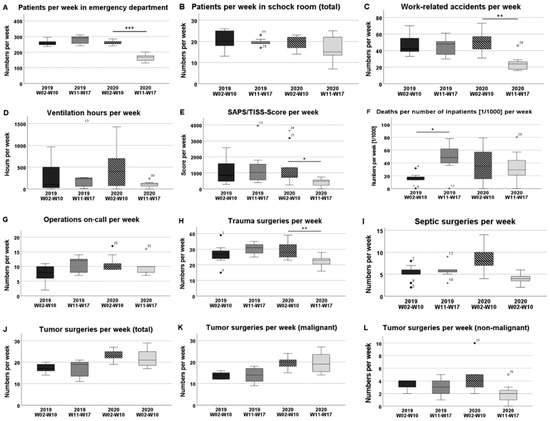 Comparison of the time phases in 2019 and 2020. The boxplots represent the investigated parameters in weeks 02–10 and in weeks 11–17 in 2019 and in 2020. The significance levels are defined as * p < 0.05, ** p < 0.01, and *** p < 0.001. (A) Patient numbers per week in the emergency department; (B) Patient numbers per week in the shock room; (C) Work-related accidents per week; (D) Ventilation hours per week; (E) SAPS/TISS-Score per week; (F) Deaths per number of inpatients (1/1000) per week; (G) Operations on-call per week; (H) Trauma surgeries per week; (I) Septic surgeries per week; (J) Musculoskeletal tumor surgeries in total per week; (K) Malignant or uncertain musculoskeletal tumor surgeries per week; (L) Non-malignant musculoskeletal tumor surgeries per week.