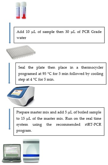 In response to the shortage of nucleic acid extraction kits needed for real-time reverse transcription PCR (rtRT-PCR) assays, we developed a method to perform the molecular assay without the need for nucleic acid extraction. The adapted method was based on boiling the sample at 95 °C to deactivate the PCR inhibitors and liberate the viral nucleic acids. This method overcomes the shortage of nucleic acid extraction kits, reduces the cost, and reduces the time from sampling to results for SARS-CoV-2 detection by rtRT-PCR. The protocol was adapted from previous methods to detect other viruses in various sample types, including serum (for dengue virus and HCV) and respiratory samples [5,6,7,8]. In these protocols, nucleic acid extraction was replaced by heat or chemical inactivation followed by amplification of the target organism’s gene(s).