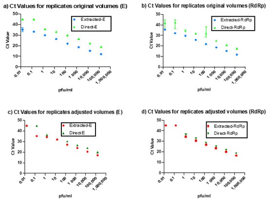 Comparison of Ct values between the extracted protocol and direct protocol using the original volumes of the extracted RNA in the E-region (a) and RdRp-region (b) compared to the extracted RNA after diluting the extracted RNA in the E-region (c) and the RdRp-region (d) to match the quantities used in the direct PCR.