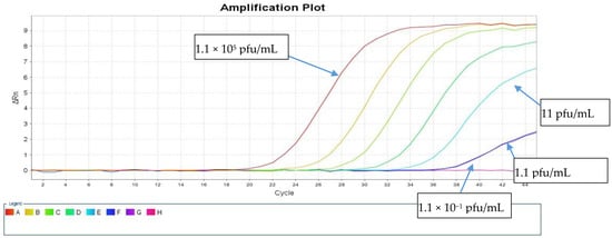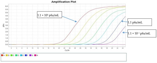 Amplification curves of the rtRT-PCR in the E region using the virus isolates at serial 10-fold dilutions using the direct method.