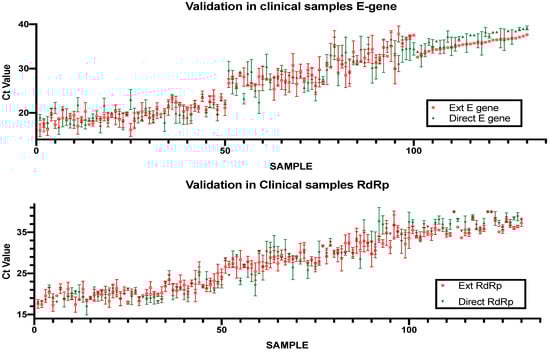 The direct rtRT-PCR method was validated using 100 clinical nasopharyngeal samples that were sent to the Special Infectious Agents Unit for diagnostic purposes. Typically, the samples are analyzed using RNA extraction followed by rtRT-PCR with the same amplification reagents used for the direct method. The rtRT-PCR was then repeated in the same plate as the direct PCR samples to guarantee the same conditions for both assays. The standard rtRT-PCR protocol served as a reference to evaluate the performance of the direct PCR protocol. Of the 100 samples, 27 were negative using the standard rtRT-PCR, and 73 were positive with Ct values ranging from 14.33 to 35.1 (Figure 5). The direct protocol showed 100% concordance with the standard protocol with an average difference in Ct values of 4.38 for the E gene and 3.85 for the RdRp gene.
