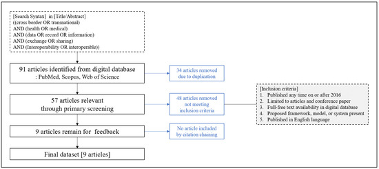 The objective of our THR system is to enable access to personal health records anywhere. To exchange health records with different countries, various aspects of interoperability should be taken into consideration. However, to the best of our knowledge, no study exists that takes analytical considerations or systematical frameworks for the THR system into account. To derive suitable elements for the THR system, we review the literature on the exchange of health information across borders or regions. Figure 1 shows the selection criteria for reviewing previous studies. We selected five main bundles of keywords to find related studies. The first group of words comprises “cross-border” or “transnational”. The second bundle includes “health” or “medical”. The third consists of “data”, “record”, or “information”. The words in the fourth group are “exchange” or “sharing”. Finally, “interoperability” or “interoperable” are in the fifth bundle. We searched three databases (Web of Science, PubMed, and Scopus) to see if titles and abstracts contained the selected keywords. At first, 91 articles were selected by electronically searching for combinations of the keywords, but 34 articles were removed due to duplication. Then, we reviewed each article’s abstract manually to exclude those whose study purpose was not closely related to ours. The inclusion criteria for the selection of previous studies were: (1) published any time in or after 2016, (2) limited to articles and conference papers, (3) full free text available in a digital database, (4) present a framework, a model, or a system architecture, and (5) written in English. Finally, nine articles were selected to review the interoperability issues [19,20,21,22,23,24,25,26,27].