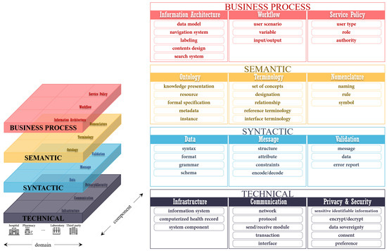Several studies analyzed interoperability in multilayered aspects [12,13,14,15,16,17]. These are in various domains, such as in military, industry, IT systems, crisis management, and public administration. Each study presents interoperability levels according to their domain-specific environments. Even in different domain environments, there is something in common. Most studies have the technical interoperability level because it is the basic requirement for transmitting data electronically among different information systems. The higher levels deal with elements that require more effort to satisfy according to domain-specific characteristics. For example, organizational interoperability includes legal, political, or even cultural aspects of the institutions that participate in data sharing. Since the level-specific requirements are different according to the domain characteristics, the lack of clear guidelines for a particular domain makes barriers to the interoperability of information systems.