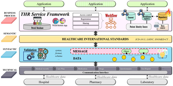 This study proposes a framework for the THR system following the level-specific interoperability guidelines defined above. Figure 3 shows an overview of the THR system framework. This THR framework consists of layers that support the four levels of interoperability defined in Figure 2. The technical layer supports communication interfaces that can be shared between other institutions or countries. Through communication interfaces, it is possible to transmit and receive healthcare data between different institutions. The syntactic layer is related to the interoperability regarding the data syntax, format, and schema. This layer validates whether a message created through the combination of raw data satisfies the syntactic feature. The semantic layer ensures interoperability for ontological parts by utilizing international healthcare standards. Finally, the business process layer supports business processes and workflows of THR services. This layer contains access control, registration, and services, which are useful functions for THR users.