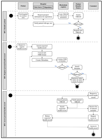 The THR framework’s components consist of five system actors: data source, repository, consumer, patient identity source, and blockchain registry. These five components are based on IHE Cross-Enterprise Document Sharing (IHE XDS.b) [28], and each system actor’s role and exchange interactions are defined as standard. Figure 4 shows an example of workflows for the THR framework. It represents the business processes defined above.