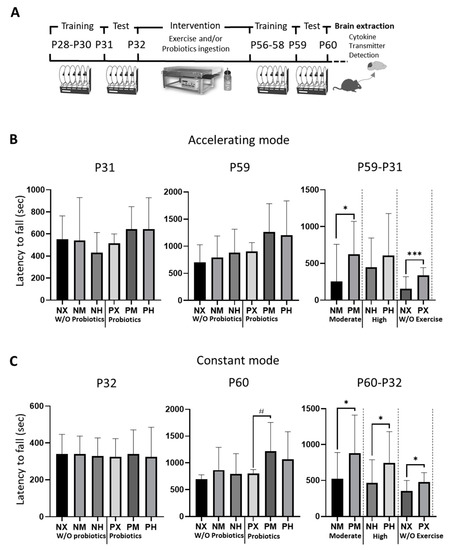 Effect of exercise and probiotics ingestion on motor function. Motor function is enhanced by probiotic ingestion. (A) Experimental timeline and schematic illustration. (B) Summary bar graphs showing latency to fall during test sessions of rotarod at accelerating mode. (C) Summary bar graphs showing latency to fall during test sessions of rotarod in constant mode. Values are presented as mean ± SD; #; p < 0.05. Significant difference was indicated by One-way ANOVA. *; p < 0.05, ***; p < 0.001. Significant difference was indicated by independent t-test. N, no probiotics; P, probiotics; M, moderate-intensity exercise; H, high-intensity exercise; X, no exercise.