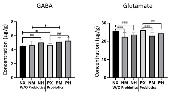 We measured the concentrations of GABA and glutamate in the cerebellum, which is the brain region responsible for motor coordination; their measured levels are shown in Figure 3. For GABA, the PH and PM groups had the highest values (5.30 μg/g, 5.15 μg/g), whereas the NM and NX groups had the lowest values (4.61 μg/g, 4.51 μg/g) (Table 4). Based on the intensity of exercise, NX and PX had significantly lower values of GABA than NH (p = 0.007) and PH (p = 0.002), respectively. Moreover, probiotic ingestion increased GABA levels in the PM and PX groups compared to the NM (p = 0.016) and NX (p = 0.003) groups. For glutamate, the PX and NX groups had the highest values (26.05 μg/g, 25.75 μg/g), whereas the NM and PM groups had the lowest values (22.45 μg/g, 23.09 μg/g). Based on the intensity of exercise, mice in the NX group had significantly higher glutamate levels than those in the NM and NH groups (p < 0.001), while the PX group showed significantly higher levels of glutamate than the PM and PH groups (p < 0.001 and p = 0.005, respectively). These results indicated that probiotic intake did not significantly affect the concentrations of glutamate.