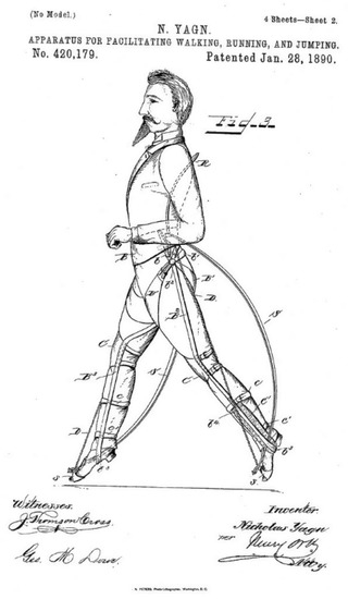 - Yagn, N. Apparatus for Facilitating Walking, Running, and Jumping. United States Patent and Trademark Office. U.S. Patent 420,179. U.S. Patent 438,830, 28 January 1890. [Google Scholar]