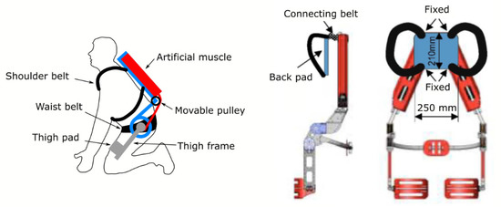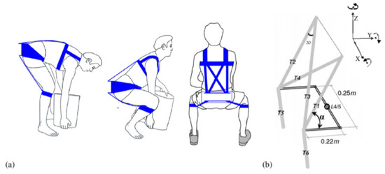 | PLAD | Industrial load carrying, reduce lower back strain | - | Elastic bands | - | One of the earlier designs—transferring of load from lower back to lower limbs | Up to 40% reduction of posterior spinal muscle EMGs at lifting tasks, and 23–29% reduction of lumbar spine compressive forces |