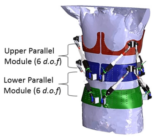 - Park, J.-H.; Stegall, P.R.; Roye, D.P.; Agrawal, S.K. Robotic Spine Exoskeleton (RoSE): Characterizing the 3-D Stiffness of the Human Torso in the Treatment of Spine Deformity. IEEE Trans. Neural Syst. Rehabil. Eng. 2018, 26, 1026–1035. [Google Scholar] [CrossRef] [PubMed]