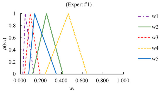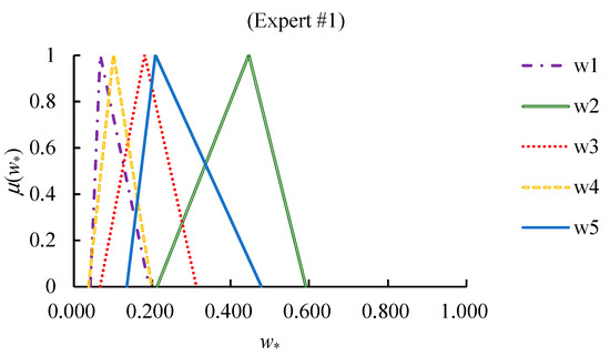 where (−) and (×) denote fuzzy subtraction and fuzzy multiplication, respectively [58]. The priorities of criteria are obtained by normalizing :