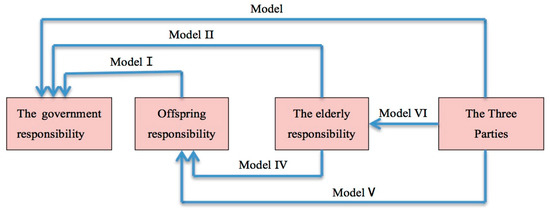 Because there are four values of dependent variables in this paper, a total of 12 models need to be fitted if each two variables are compared. However, because there is an opposite-sign relationship between the coefficients of each two variables, only half of the models need to be listed. Moreover, the coefficients of the other six models can be deduced from the coefficients of the six models listed. If the coefficient is known, the OR value will be known. Government responsibility, offspring responsibility and responsibility by the elderly are taken as the reference groups, and finally, six multinomial regression models are selected (Figure 1). Among them, taking government responsibility as the reference group, there are four values of dependent variables, and models Ⅰ, Ⅱ and Ⅲ can be fitted. Taking offspring responsibility as the reference group, there are three values of dependent variables, and models Ⅳ and Ⅴ can be fitted. Taking the elderly responsibility as the reference group, there are two values of dependent variables, and model Ⅵ can be fitted.