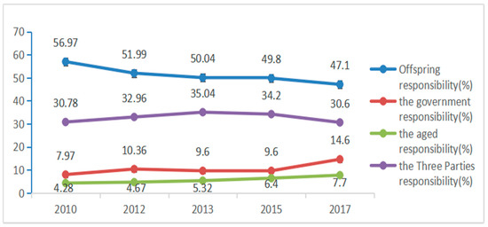 At present, there is little research on cognition of old-age care responsibility (COACR) in China. Focuses on the COACR of rural elderly people in China and believes that rural elderly people with different characteristics have different cognition and that pension insurance has a limited impact on their cognition [35]. After surveying eight counties and cities in Hunan province, Luo found that land-expropriated farmers believed that local governments, families and village collectives should bear all or part of the responsibility for old-age care, accounting for 73.8%, 69.6% and 44.3%, respectively [9]. These studies combine theory and empirical evidence and offer important reference values to future studies, but there are also some deficiencies. First, the research focus is too narrow, and the research content is not sufficient. Second, the research focuses on a particular group or a certain local area, such as families that lost an only child, only-child families, land-expropriated farmers, rural residents, and migrant populations, whereas there are few studies on the overall COACR in China. Third, existing studies focus on cross-sectional data analysis rather than tracking the changes and trends of old-age care concepts. By examining the whole of China, not only based on the 2017 Chinese General Social Survey (CGSS) data but also with reference to the data from 2010 and 2015, this study can grasp the transformation of Chinese residents’ concept of old-age care and its influencing factors as a whole and can provide an important reference for the Chinese government to formulate scientific and reasonable old-age care policies.
