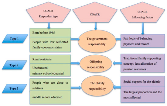 In the context of ageing, China’s old-age care tasks and circumstances will become increasingly severe, and who will provide for the aged has become a practical problem. Based on CGSS data from 2017, 2072 valid samples were selected, and data from 2010–2015 were tracked to conduct a comprehensive analysis of Chinese residents’ COACR in this paper. This study found that the residents tend to be diversified with regard to COACR. It is still a common element of COACR that offspring provide for the aged, and family support is still the dominant position of COACR in China. However, this cognition of responsibility is gradually weakening and is being replaced by the governmental responsibility, self-responsibility by the elderly and three-party responsibility, and people are increasingly beginning to agree that government and the elderly responsible for the elderly.