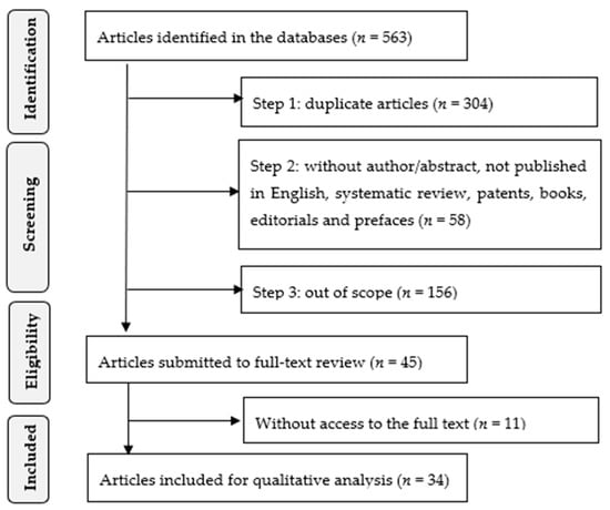 All articles not published in English, without abstract, without author, and without access to the full text were excluded. In addition, systematic reviews, patents, books, editorials, and prefaces were also excluded, as well as all articles that did not address the concept under analysis or were not relevant to the specific purpose of this review.