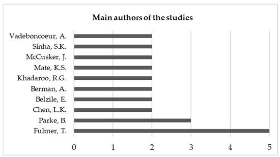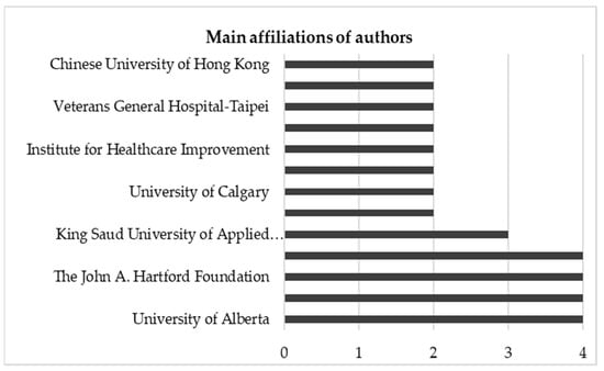 As for the authors’ affiliation, there was a higher incidence associated with the University of Alberta, the University of Taiwan, the University of Toronto, and the John A. Hartford Foundation, with four authors each. Figure 3 shows the number of publications by institution, with more than one author. In turn, the profile of the authors indicated that the vast majority of the studies involved health care providers and researchers (n = 15 articles), followed by studies developed exclusively by researchers (n = 14 articles) and, finally, articles written only by health care providers (n = 5 articles).
