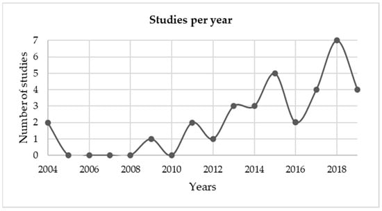 Given the novelty of the theme, 2018 presented a peak in publications in the area (n = 7 articles), followed by 2015 (n = 5 articles). Figure 4 shows the number of publications per year.