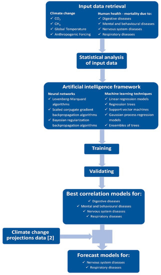 These studies have almost all focused on examining the correlation between a disease and some aspects of climate change, referring to a specific area, usually a city or a nation [10]. In this work a framework based on Artificial Intelligence techniques has been developed to analyze the correlation between climate variability and main mortality diseases on global scale, and to predict a future scenarios by the tested best correlation models, using as input a climate change forecast developed by NASA [2].