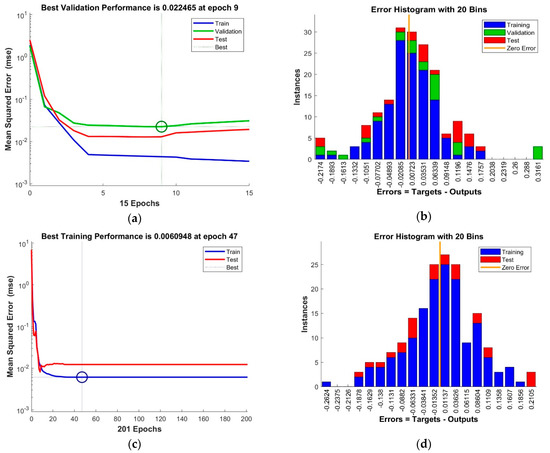 Neural networks performance: (a,b) with Levenberg-Marquard algorithm; (c,d) with Bayesian regularization backpropagation algorithm.