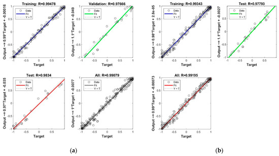 Neural networks performance: (a) with Levenberg-Marquard algorithm; (b) with Bayesian regularization backpropagation algorithm.