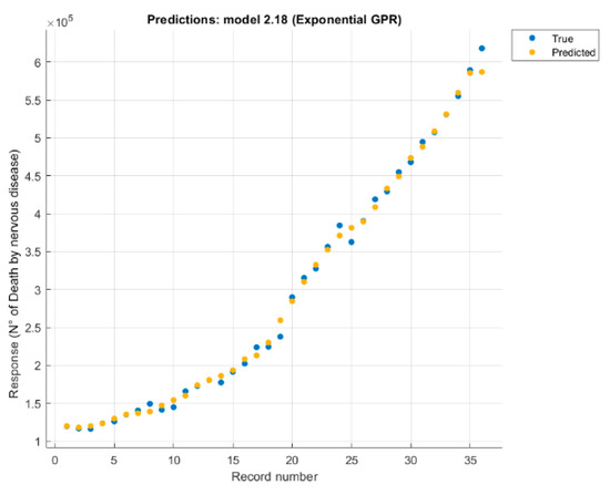 Response plot for nervous system disease deaths, predicted with three features, using Exponential Gaussian Process.