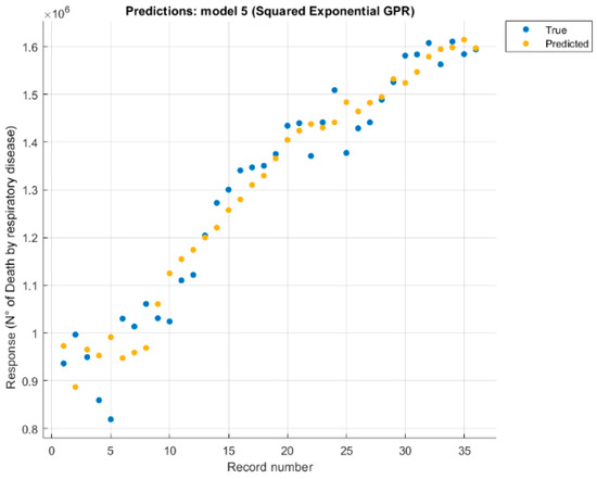 Similarly, a future 10-year scenario was created based on the model referring to the victims of respiratory diseases. Figure 11 shows a possible future scenario, 10 years as before, but with a notable difference: the increase in casualties is not so remarkable but is almost linear with the curve of real data. Not having used a linear method for the predictive model, the almost linear trend suggests that the temperature variable’s fluctuating trend, which is fundamental in this model, can also influence the future trend.