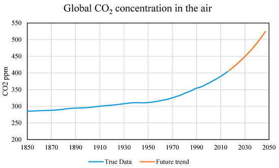 Global CO2 concentration in the air: true data [2] and future trend.