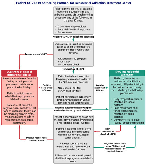 All patients seeking entry into the addiction treatment program were required to complete the COVID-19 screening process. Between 1 February 2020 and 1 July 2020, a total of 420 new patients underwent screening. Patients came from 18 different states, with the majority from Connecticut (n = 277; 70.0%), New York (n = 82; 19.5%), and Massachusetts (n = 24; 5.7%). Of the 420 patients screened, 415 of them screened negative and entered the residential community. Three patients had positive COVID-19 nasal swab tests during screening prior to entry into the residential community. One patient had a negative nasal swab test during screening. One patient screened negative for COVID-19, entered the residential community, and later tested positive. The screening protocol (Figure 1) shares many components outlined by the American Society of Addiction Medicine (ASAM) COVID-19 Task Force recommendations for COVID-19 infection mitigation in residential treatment facilities [11]. Each patient must pass this series of screenings denoted in grey boxes prior to either entering the residential community (green box) or being prompted to quarantine at home before returning to the addiction treatment center (red box).