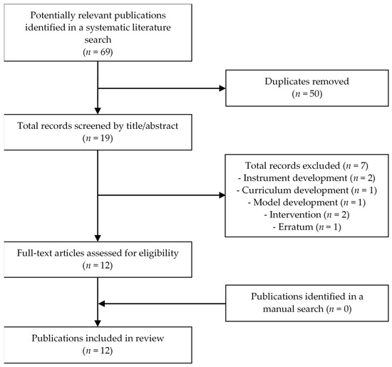 The search yielded 69 articles published between 1992 and 2021. After scrutinizing the relevant titles and abstracts, as well as the full texts, we identified 12 papers that were suitable for inclusion and were subsequently reviewed (see Figure 1).