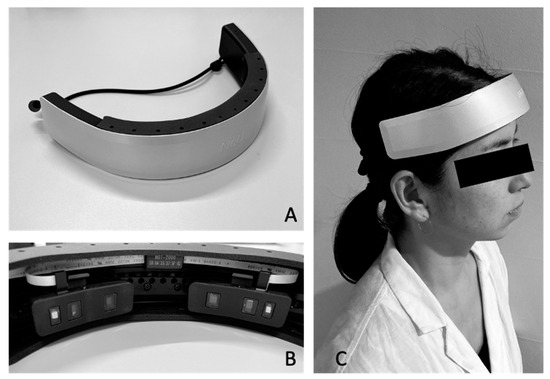 Photographs of the device used to measure brain activity (HOT-2000). (A) overall device view. (B) Close-up view of the sensor units. (C) Photograph of a subject wearing the device.