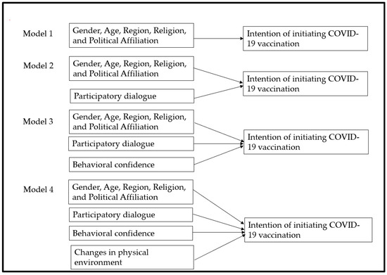 All analyses were conducted using IBM SPSS v.26, (IBM Corp., Armonk, NY, USA) and SAS 9.3 (SAS Institute, Cary, NC, USA). Descriptive and exploratory analyses were utilized to investigate data distribution, normality, missing values, and outliers. All assumptions of the statistical tests were assessed. Categorical variables were compared among vaccine-hesitant and non-hesitant groups by Chi-square analyses. The follow-up contingency table analysis (post-hoc) was conducted to obtain p-values corresponding to multilevel variables. The observed p-values were Bonferroni-corrected in multiple comparisons to prevent type 1 errors [35]. The values of adjusted residuals (or Z scores) were used to generate Bonferroni-corrected p values. Effect sizes were reported wherever appropriate. Continuous variables, such as age, advantages, disadvantages, participatory dialogue, behavior confidence, and changes in the physical environment were compared among groups using independent-samples t-tests or Welch’s t test where equal variance could not be assumed. A square root transformation was applied to the non-normally distributed variables, which were later back-transformed for the ease of interpretation. A bivariate Pearson’s correlation was also conducted to investigate the relationships between the MTM constructs. We also calculated the proportion of perceived advantages and disadvantages among hesitant and non-hesitant group. Hierarchical regression modelling was performed to determine the increment in variation (by R-square change) accounted for through addition of predictors over a set of models. The details about the model building process is provided in the Figure 1 given below. The statistical significance was set at 5% for all analyses. For polytomous variables (e.g., region, religion, and political affiliation in our dataset), we used dummy coding by converting the polytomous categorical variable into a series of dichotomous variables for each level where a value of 1 was assigned for each observation at that level and zero for all others. The level of categorical variable which was coded zero at all levels was considered a reference category. The algorithm of the dummy coding is described in the Appendix A Table A1. Prior to running analyses, we conducted power analyses to determine whether our sample was sufficient to detect the hypothesized effects. The following formula was used to compute sample size: n = (z)2 p (1 − p)/d2 with a 95% confidence interval (alpha = 0.05, z = 1.96), and a margin of error d = 5%, and the proportion of vaccine hesitancy among Blacks was 18% in May 2021 based on the data reported by the Office of the Assistant Secretary for Planning and Evaluation Report [36]. The estimated sample size was 227 and the true sample size was increased to 428 allow group comparisons. We used a Checklist for Statistical Assessment of Medical Papers (CHAMP statement) for our results’ reporting [37].