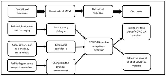 Diagrammatic depiction of how the multi-theory model (MTM) for health behavior change can be used to improve the COVID-19 vaccine uptake behavior through an m-health intervention.