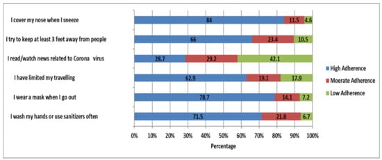 Figure 1 illustrates how the participants adhered to precautionary behavioral acts. The prevalence of high adherence rates was high for cleaning hands (71.5%), wearing masks (78.7%), social distancing (66.0%), and covering the nose when sneezing (84.0%). Somewhat low adherence rates were found for limiting travel (62.9%), indicating that social isolation is a stressful behavior for this population group.