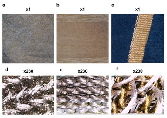 The three types (a–f) of conductive material (1× and 230× magnification).